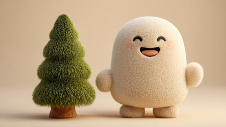 A vibrant and joyful cartoon character stands next to a cute green tree, radiating happiness. Ideal for creative projects, children's materials, and playful designs.
