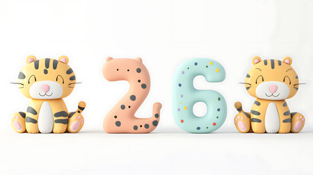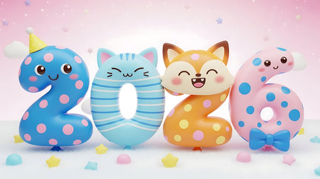 A joyful and colorful 3D rendering of the numbers 2026, creatively designed as cute animal characters and festive balloons. Each number features unique patterns like polka dots and stripes, with charming faces, a party hat, and a bow, set against a whimsical pink background with stars. Perfect for New Year celebrations, birthdays, or children's events.