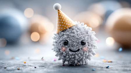 A fluffy, gray character with a smile wears a party hat and stands amidst scattered confetti and colorful balloons at a cheerful celebration. The atmosphere feels joyful and festive.