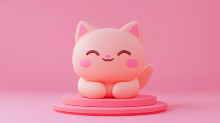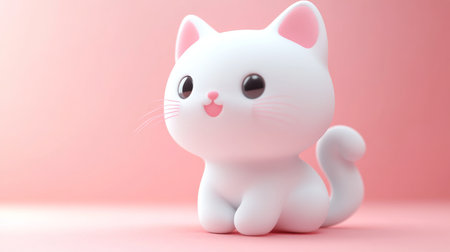 A cartoon cat with a cheerful expression leans against a soft pink wall. The white character has rounded features and rosy cheeks, set against a monochromatic background. The digital art is likely for commercial and editorial uses. The smooth texture of the character gives it a friendly look.