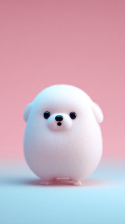 A cute white puppy toy with black eyes and nose, set against a soft pink and blue backdrop.
