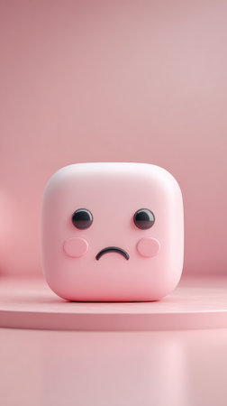 A sad pink cube character with black eyes and a curved mouth on a pink background.
