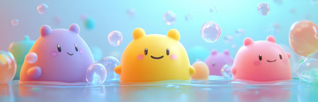 A delightful scene featuring cute, colorful cartoon characters surrounded by bubbles in a soft blue background. This whimsical image exudes joy and warmth.