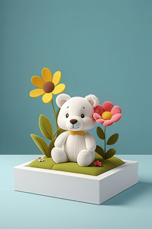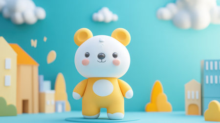 A cute cartoon bear character stands in a vibrant, pastel-themed environment. This playful scene features soft shapes and colors, perfect for childrens themes.