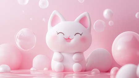 This adorable cartoon cat character showcases a joyful design with a playful pose. Surrounded by soft pink bubbles, it radiates charm and happiness.