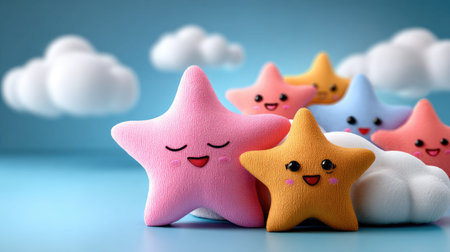 Adorable plush stars display cheerful expressions against a dreamy sky backdrop with soft clouds, ideal for children's themes, decor, and playful storytelling.