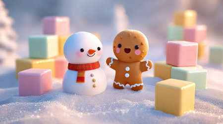 Cute chibi snowman and gingerbread man happily stack colorful Christmas cubes on a soft, snowy field under gentle light.