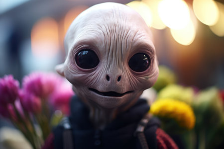 Cute alien with glowing eyes standing in a dreamy flower field, soft light and bokeh background