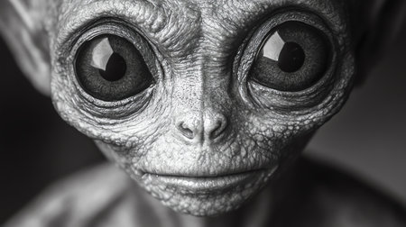 Monochrome closeup of an alien face, large dark eyes, highly detailed textured skin