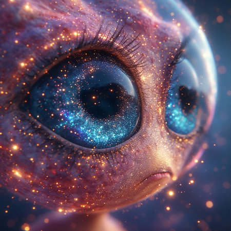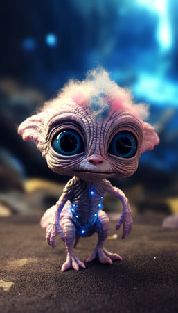Cute alien creature with big eyes and colorful bokeh background, fantasy art. Imagination and creativity concept