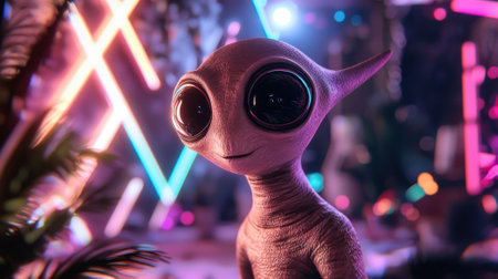A friendly alien figure with oversized eyes stands amidst colorful neon lights in a lively urban environment, capturing a whimsical yet futuristic atmosphere.