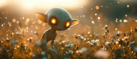 Cute alien with glowing eyes standing in a dreamy flower field, soft light and bokeh background