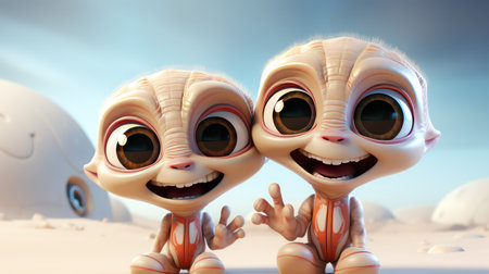 Charming cartoon alien character pointing in a whimsical 3d render style portrait photography