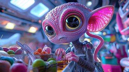 An alien creature with large eyes examines a colorful array of fruits in a futuristic spaceship. The setting features advanced technology and bright lights, creating a lively atmosphere.