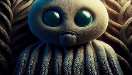 An AI generated illustration of a cute octopus toy in a dress with huge neon eyes