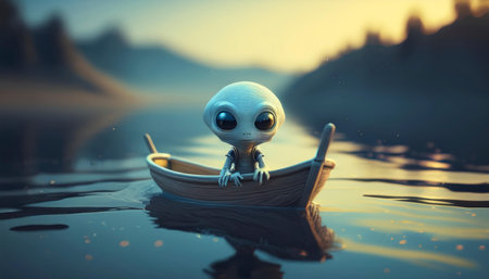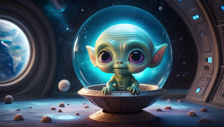 A charming alien creature with large, soulful eyes emits a gentle glow, adding a touch of whimsy to a softly lit interstellar scene.