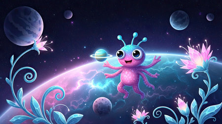 An adorable cartoon alien with bright colors is the central focus of this image. It stands in a fantastical space setting, surrounded by planets, flowers, and glowing nebulas, with vibrant pink and blue hues dominating the scene. The illustration uses a digital painting style and could be suitable for children's books or educational materials.
