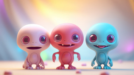 Three cute and funny alien characters with big heads and large eyes in a variety of poses.