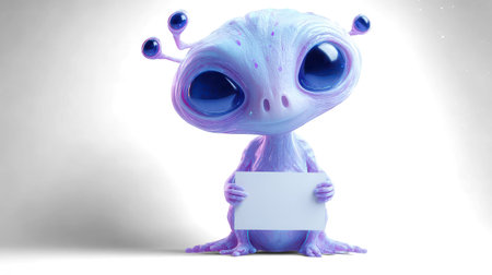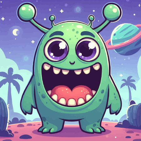 A whimsical cartoon alien character with big eyes sits in a serene night sky, featuring glowing accents. This imaginative illustration evokes charm and creativity, perfect for various themes.