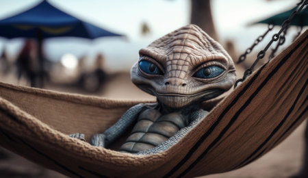 An AI generated illustration of an alien relaxing in the hammock at the beach