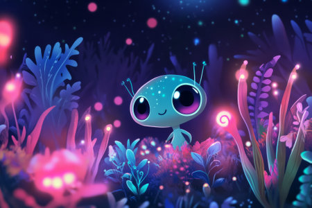Illustration of a tiny, adorable alien exploring a new planet. With its big eyes and friendly smile, the alien interacts with glowing plants and quirky creatures, creating a sense of curiosity and fun for children space themed stories.