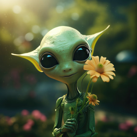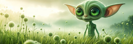 Cartoon alien with large green eyes and pointed ears, standing amidst a field of white flowers.