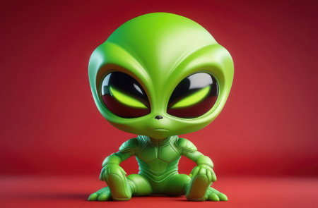 cute sci-fi illustration of funny green humanoid alien with big head and eyes on red background