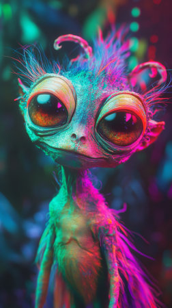 Colorful alien creature with large eyes in neon lights, whimsical fantasy setting. Sci-fi character design concept