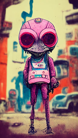 Adorable alien strolling across a bustling urban street, embracing city life and adventure