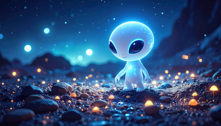 Glowing alien figure in a starry landscape illustrating a whimsical extraterrestrial fantasy concept.