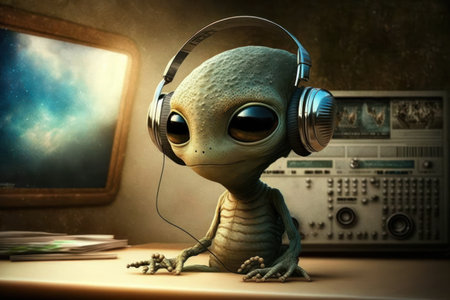 Happy alien listening music with headphones. Generative AI