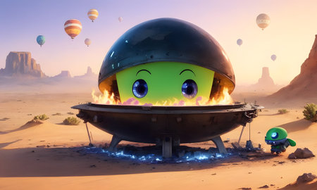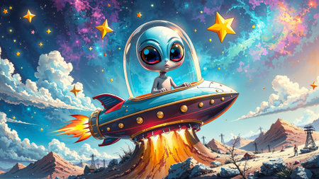 Adorable alien in colorful spaceship exploring a starry fantasy landscape.