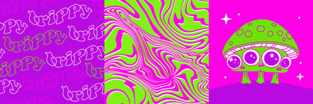 Psilocybin mushrooms cards or covers set. Psychedelic patterns with magic mushroom character, a group of fungi that contain psilocybin which turns into psilocin upon ingestion. 90s neon vector design.