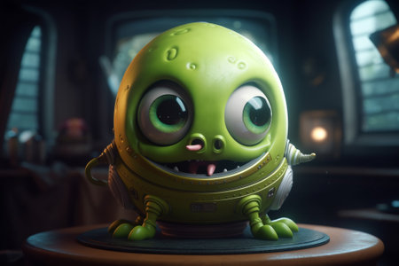 3D rendering of a cute cartoon alien with green eyes and teeth.