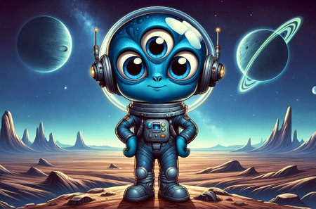a cartoon character of an alien creature with three eyes and blue skin, wearing a space suit
