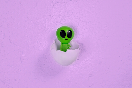 the green alien is smiling in the eggshell. purple background. toned