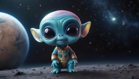 Cute alien standing on an alien planet with stars background