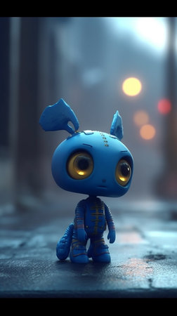 A little blue robot standing on the street at night. 3D illustration.