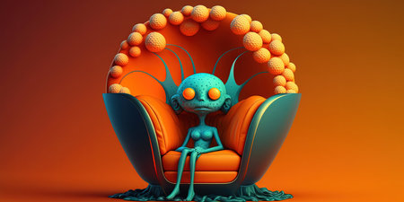 Picture of an alien model sitting in a large fluffy armchair with an orange fruit in place of a head isolated against a psychedelic gradient background
