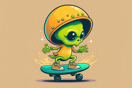 Cartoon symbol depicting a cool extraterrestrial riding a skateboard. sport and science symbol idea isolated. cartoonishly flat