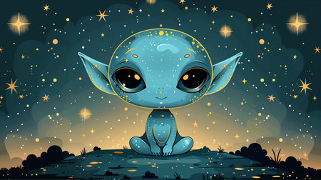 An illustration of cute, child-like alien sitting on the background of night sky with stars.