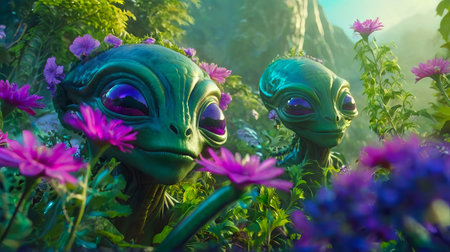 Cute friendly green aliens with large eyes among purple flowers in a lush landscape in Futuristic alien terrain. Fantasy world. Concept of extraterrestrial nature, alien life, sci-fi, whimsical world