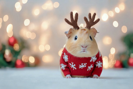 A guinea pig dressed in a red sweater with white patterns sits on a soft surface. It has small reindeer antlers and a charming expression. Soft bokeh lights create a festive atmosphere.