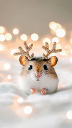 A small hamster adorned with sparkly antlers is perched on a soft surface, surrounded by twinkling lights.