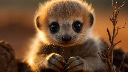 Close-up photo of a baby meerkat with big eyes, in its natural habitat, bathed in warm sunset light.