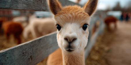 Cute young alpaca exploring its farm environment during a cloudy afternoon