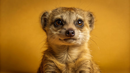 A meerkat with curious eyes stares intently at the camera against a yellow background.