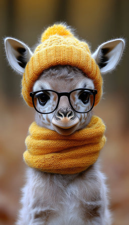 A young giraffe dressed in a cozy yellow hat and scarf stands in a serene forest, exuding charm and warmth.