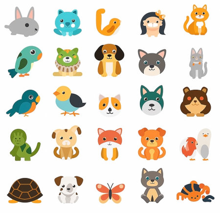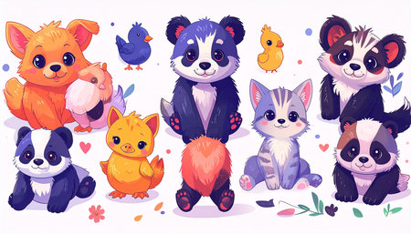 A collection of adorable cartoon animals, including pandas, a dog, a cat, birds, and chicks, playfully arranged against a white backdrop with scattered floral elements