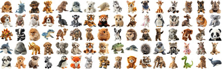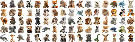 Big set of cute fluffy animal dolls for nursery and children toys, many animal plush dolls photo collection set, isolated background AIG44